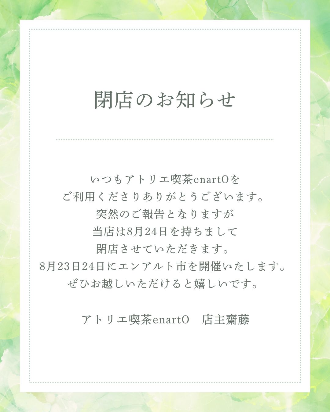 いつもアトリエ喫茶enartOをご利用くださりありがとうございます。