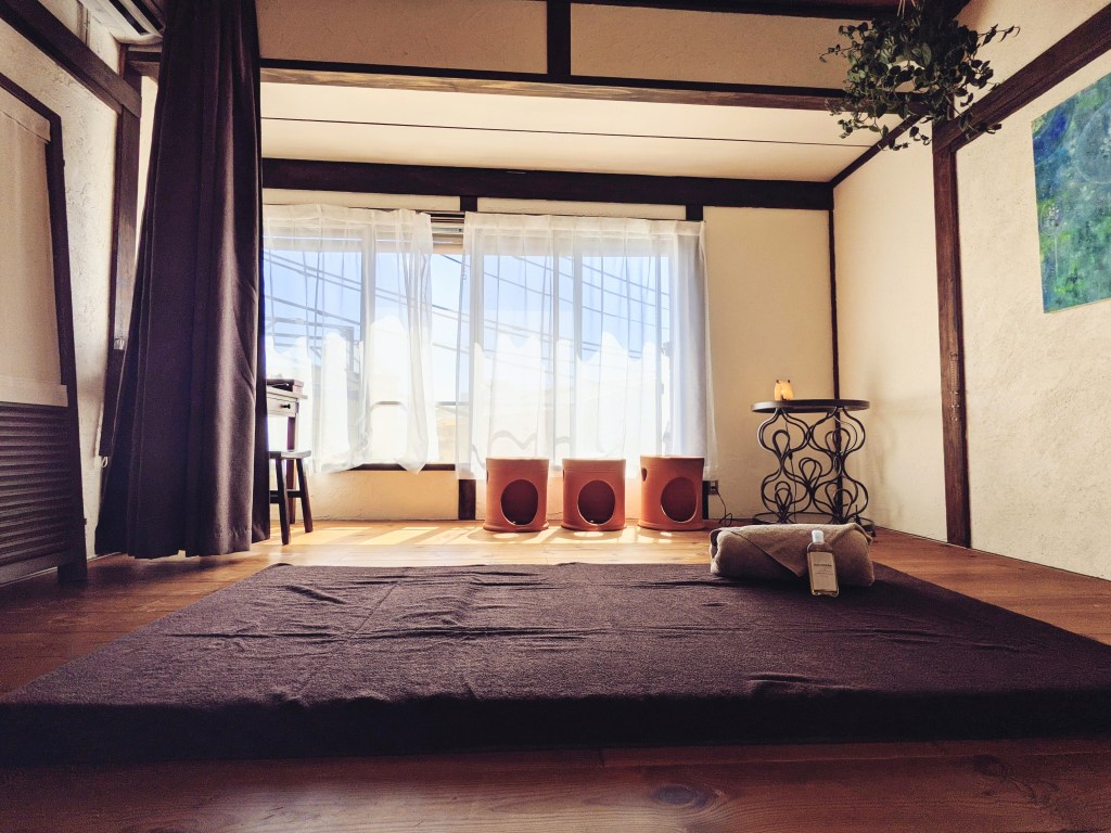 2階はレンタルのご予約が入っていない時に黄土よもぎ蒸し、足もみサロンになります。足もみの他、全身整体の施術もあります。体の芯からあったまりましょう!