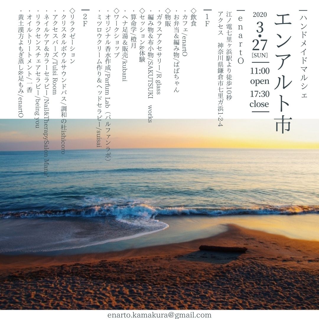エンアルト市を開催いたします。〜食べもの・WS・手仕事・リラクゼーションが集まるマルシェです〜ぜひお越しください。 4月27日(土)28日(日)11:00~16:30 会場 アトリエ喫茶enartO江ノ電七里ヶ浜駅から徒続きを読む “4月エンアルト市のお知らせ”